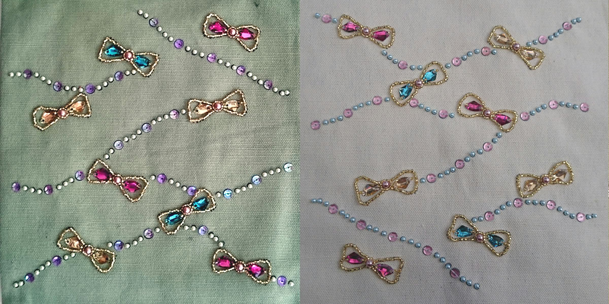 図案の転写された布地にビーズを縫いつけて作る、簡単なビーズ刺しゅうのキットです。