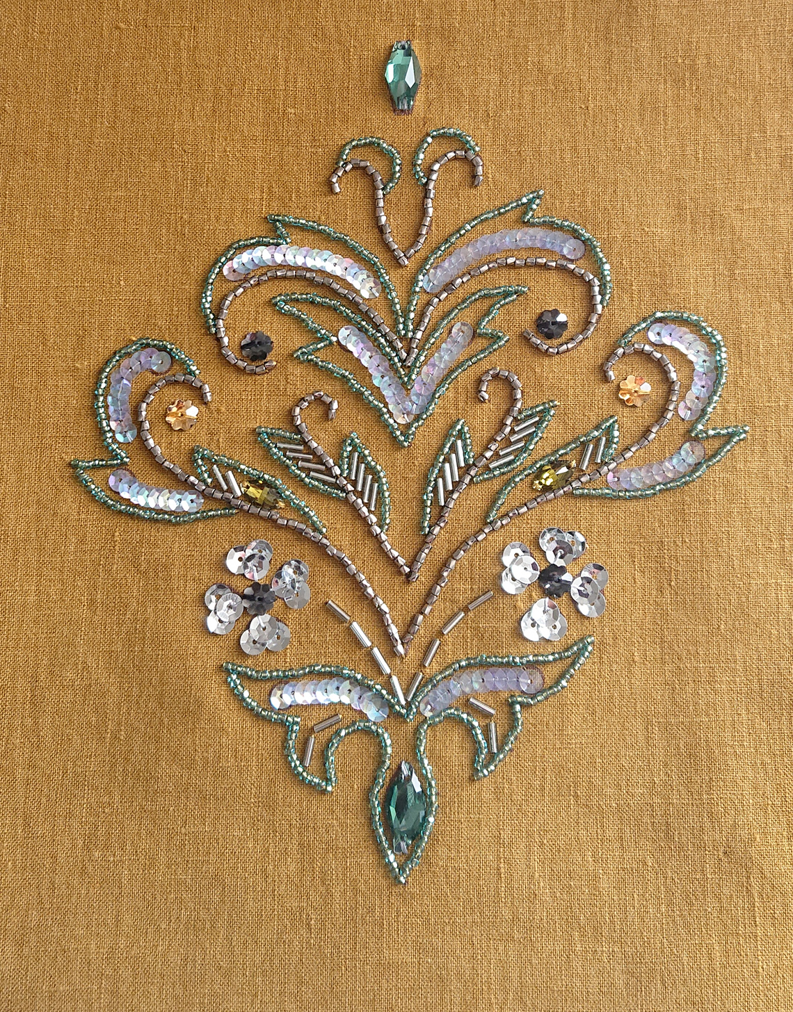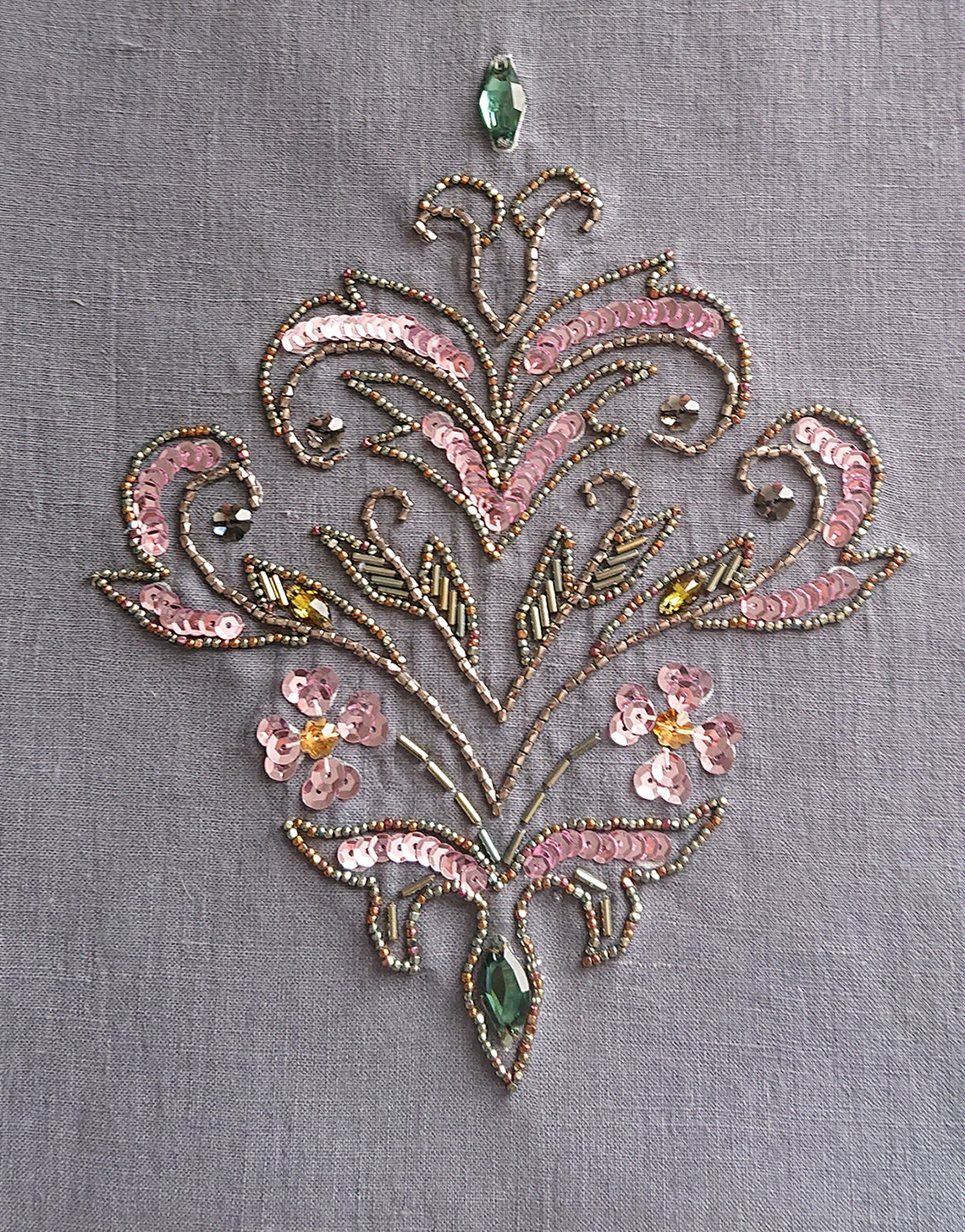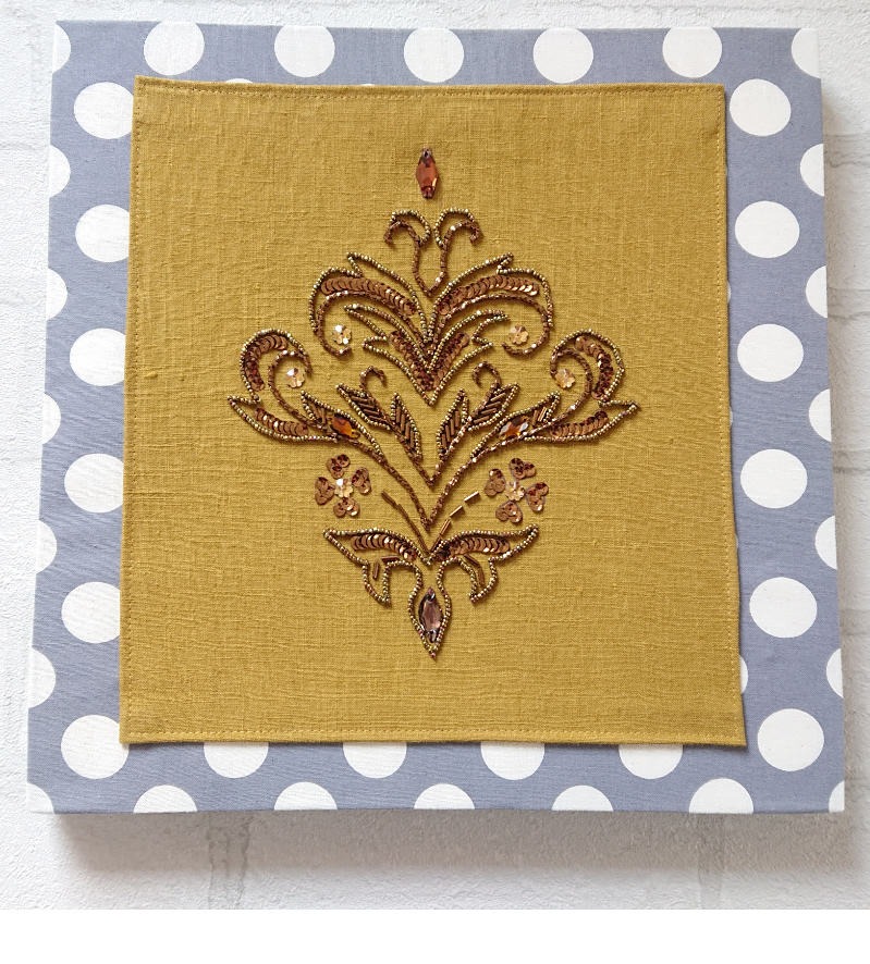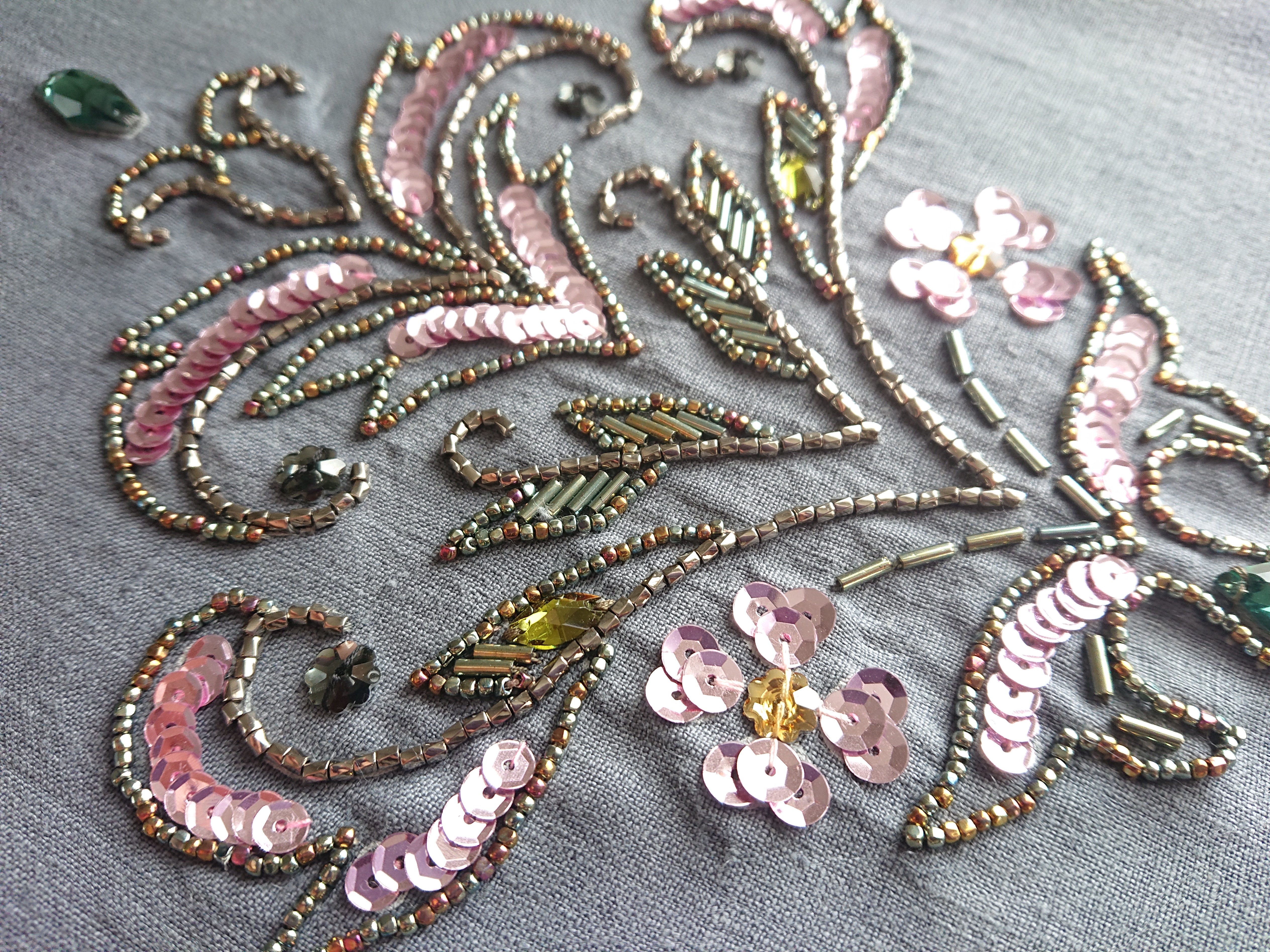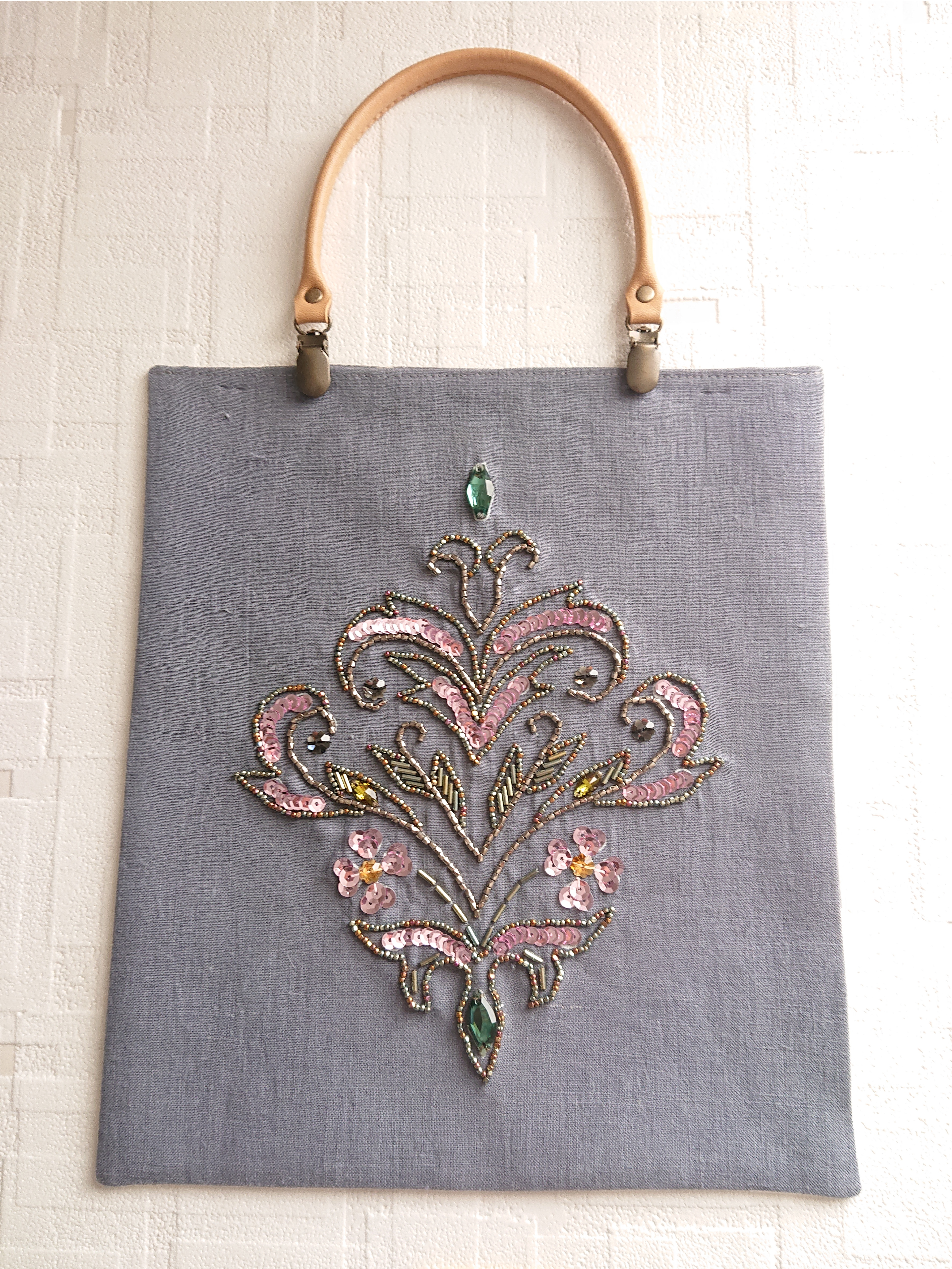 図案の転写された布地にビーズを縫いつけて作る、簡単なビーズ刺しゅうのキットです。