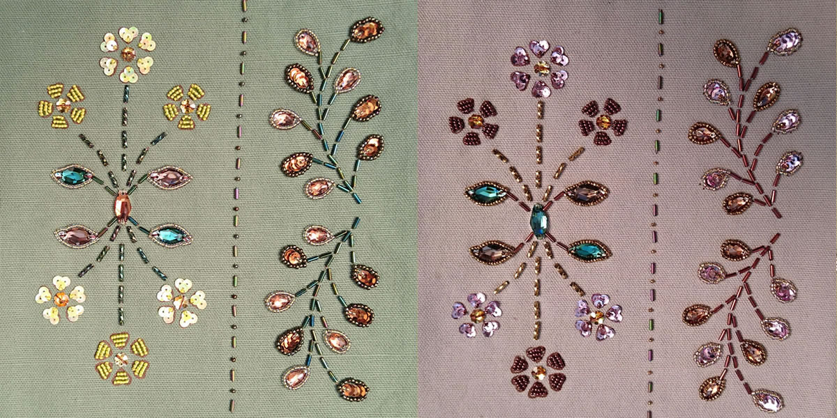 図案の転写された布地にビーズを縫いつけて作る、簡単なビーズ刺しゅうのキットです。