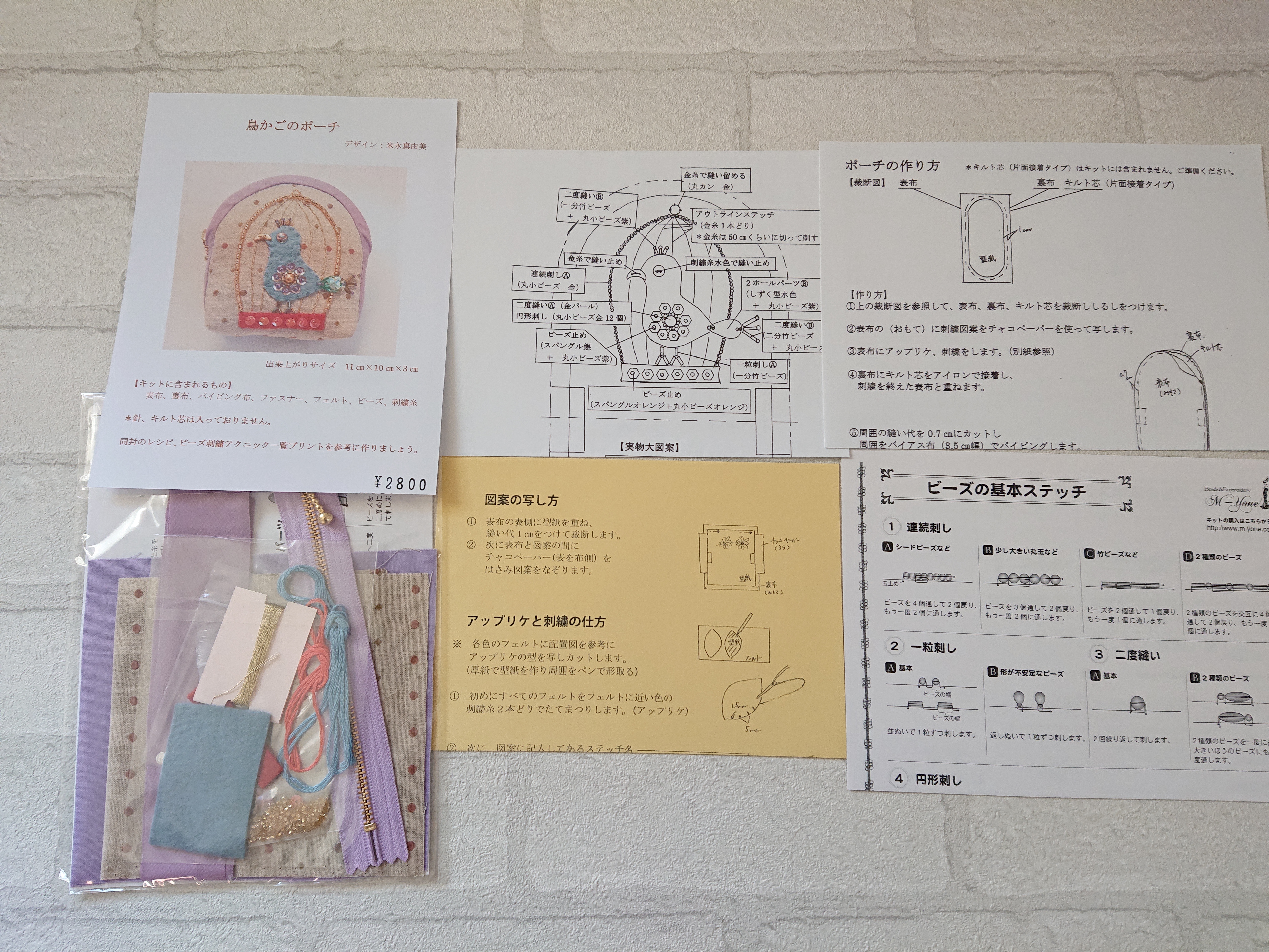 【内容】 表布、裏布(綿)、ファスナー、パイピング布、刺繍用ビーズ、刺繍糸、フェルト、型紙、他