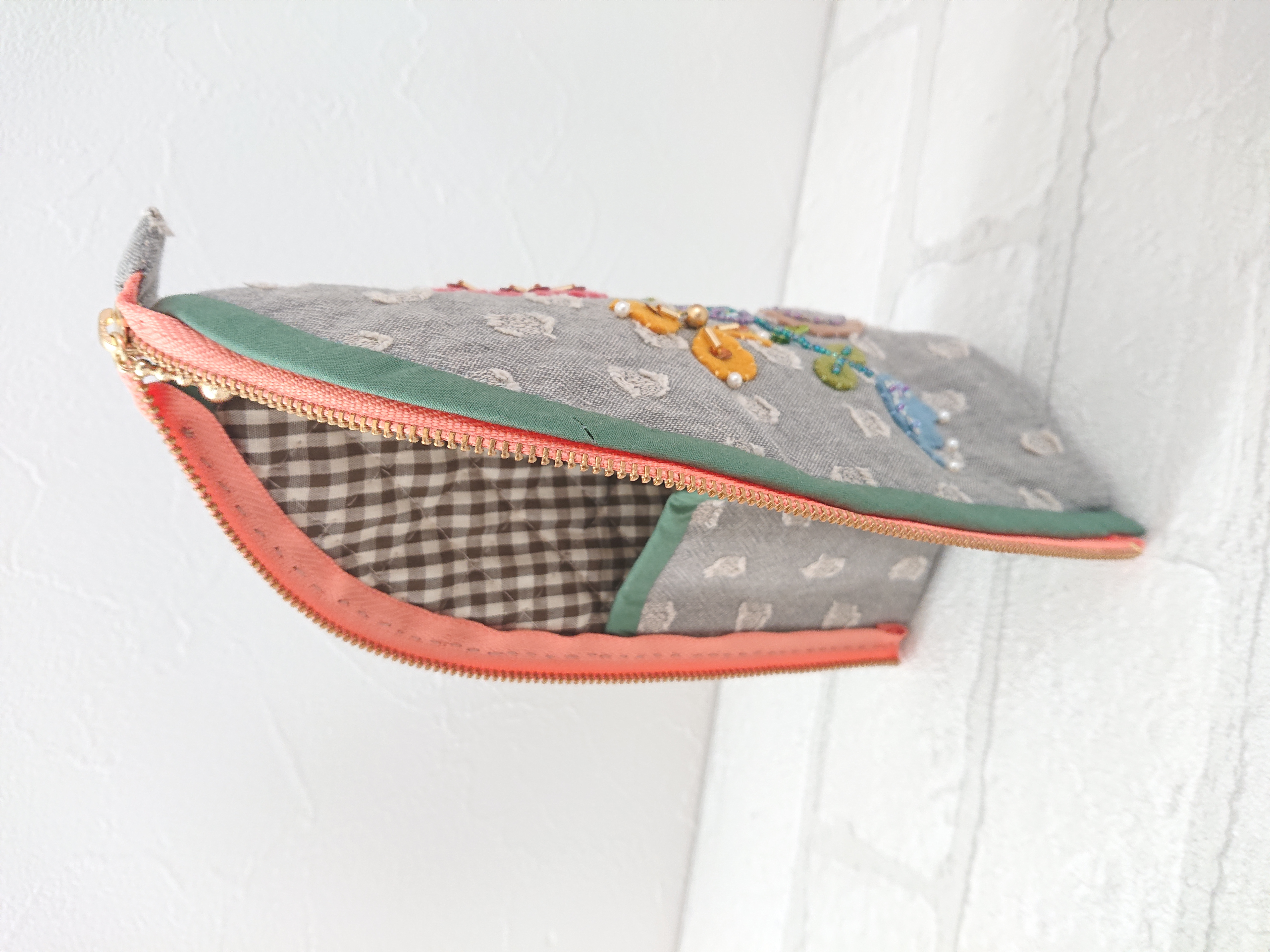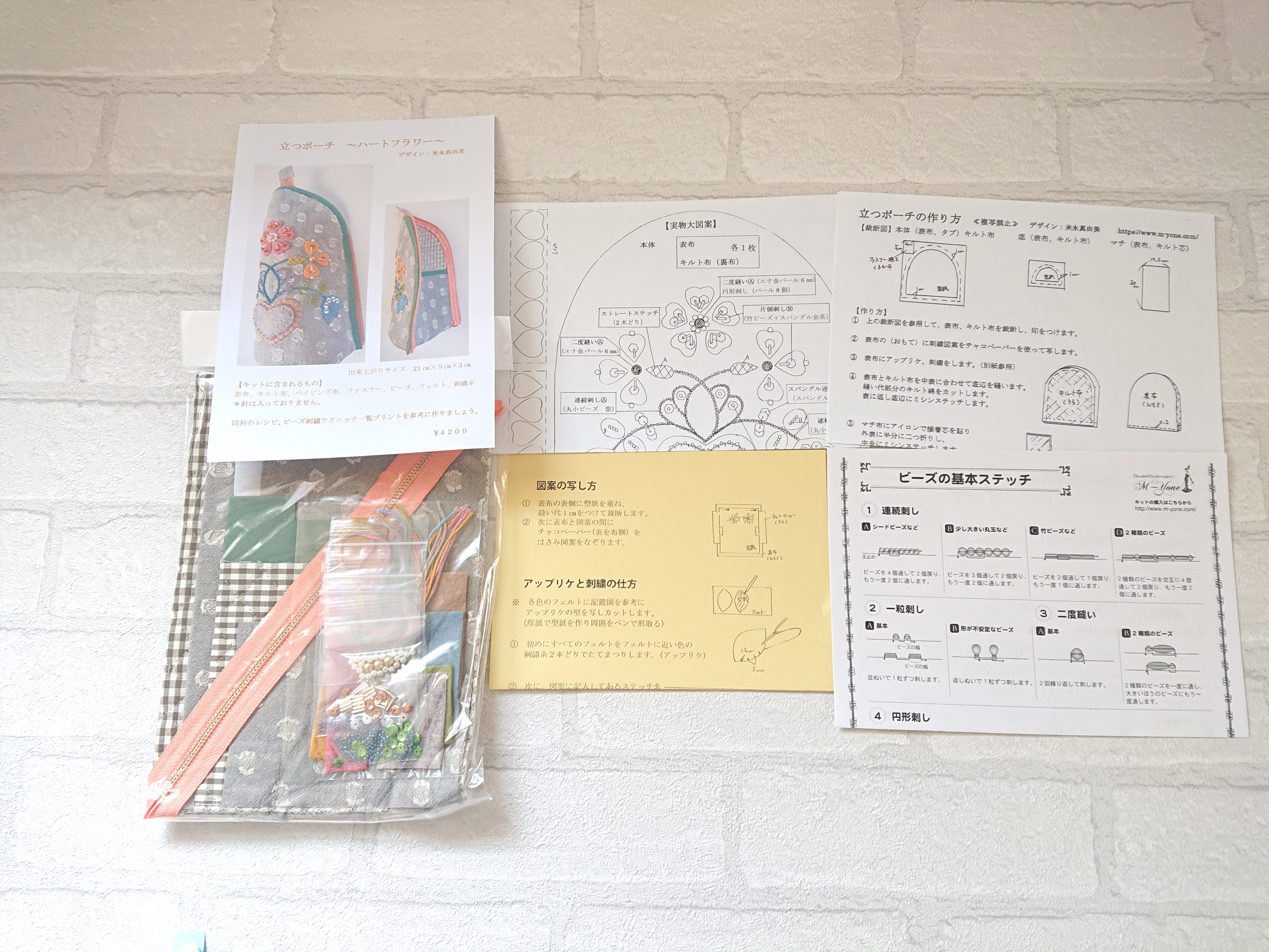 【内容】 表布、キルト裏、ファスナー、パイピング布、刺繍用ビーズ、刺繍糸、フェルト、型紙、他