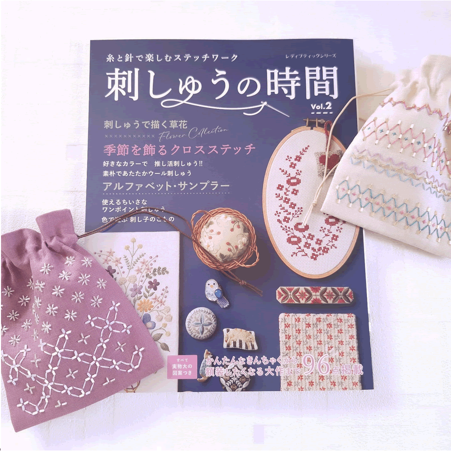 気軽に刺せる小さな作品から、額装して飾りたくなる大作まで幅広く、掲載点数96点。