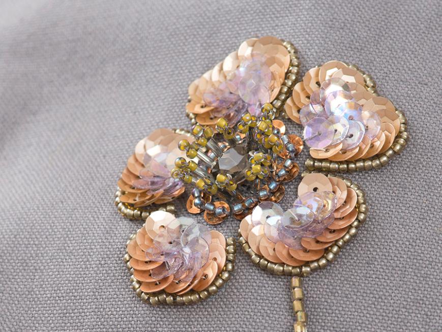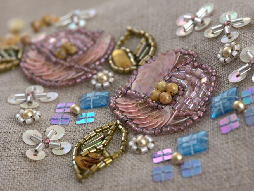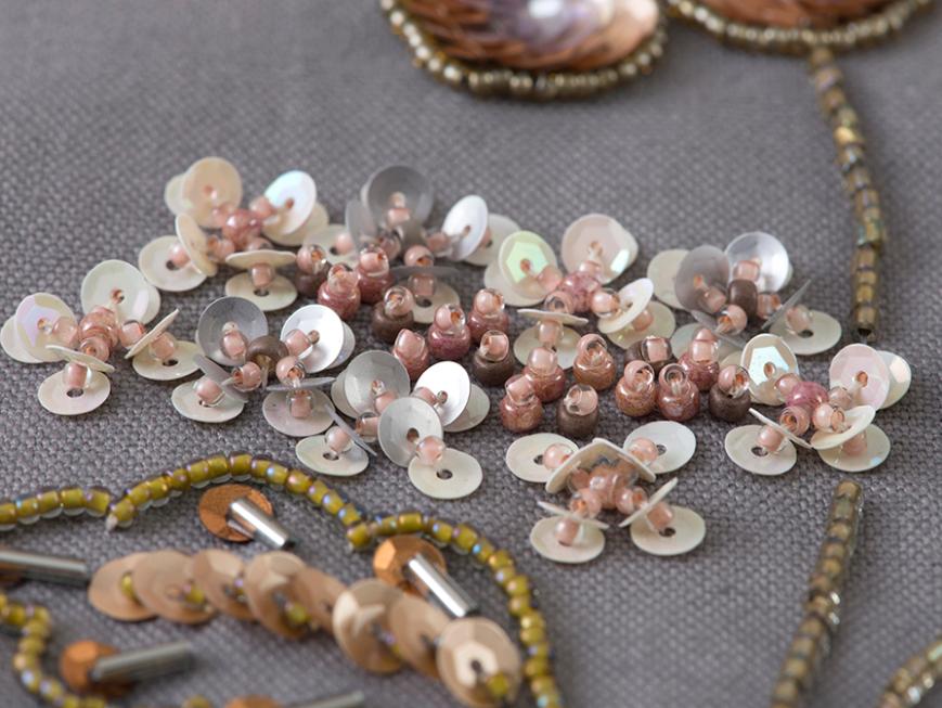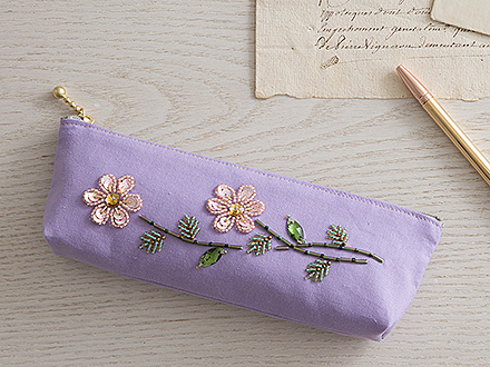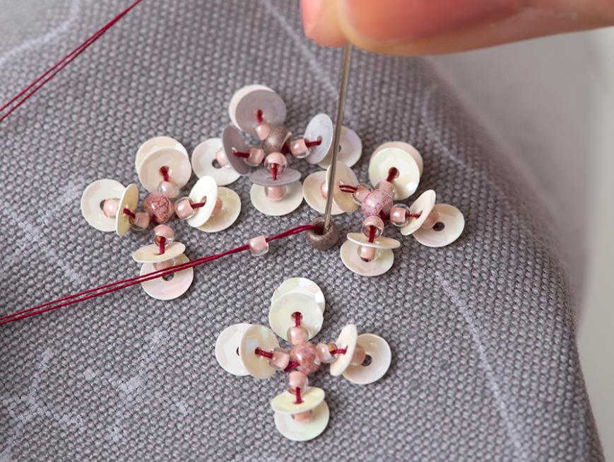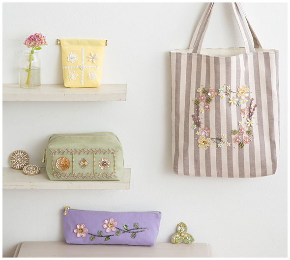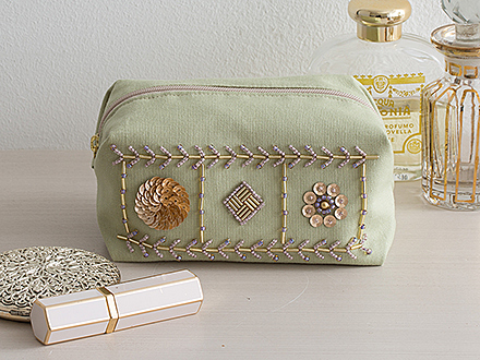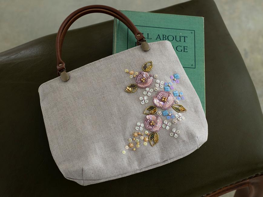 米永真由美のビーズ刺しゅうスペシャルキット。バッグの仕立て方も学びながら、ピンクのバラの花をモチーフにしたミニバッグを作ります。花びらや葉っぱをスパングルやビーズで埋めるように刺しゅうして、カラフルな小花を散りばめます。ビーズ刺しゅうの重要なポイントは、ミニ動画でも解説しています。