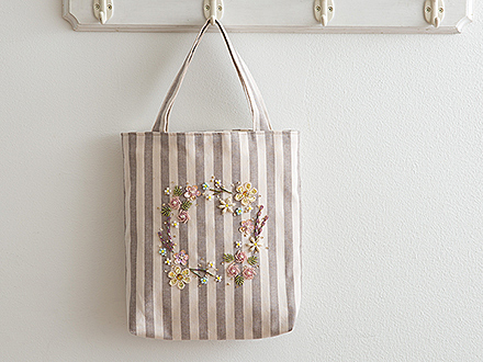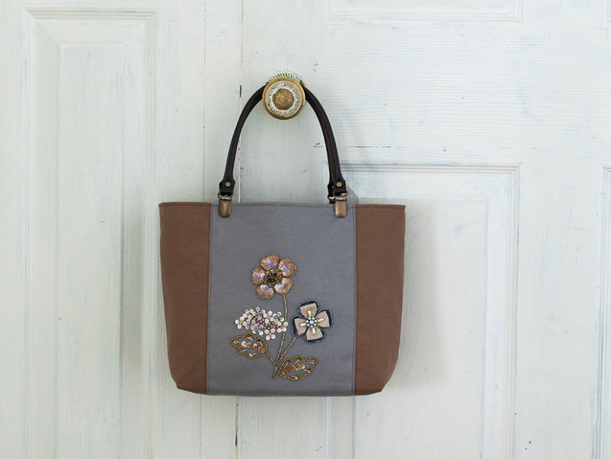 米永真由美のビーズ刺しゅうスペシャルキット。落ち着いたカラーのビーズやスパングルを使って、どんな装いにもマッチするシックなトートバッグを作ります。竹ビーズを使って花芯を立体的に刺すテクニックや、スエードを組み合わせる方法が登場。B5サイズの本がすっぽりと入る便利なサイズです。ビーズ刺しゅうの重要なポイントは、ミニ動画でも解説しています。